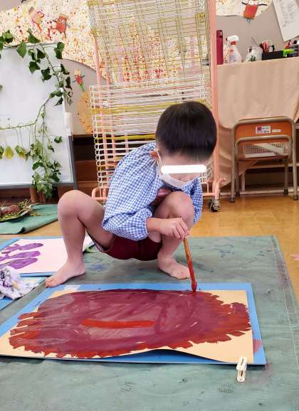 今日はあいにくの雨模様でしたが、子どもたちは昨日のおいもほりの経験を絵に表現していました。大きなおいもが出てきて嬉しかった気持ちや、長いツルや葉っぱのおもしろさをのびのびと描いていますね!