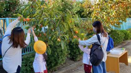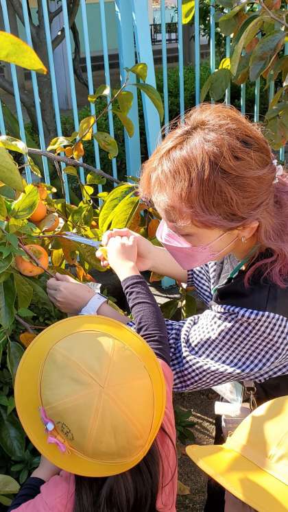 園庭のカキの木にたくさんの実が実り、降園時におうちの人と収穫して持ち帰りました。「どれが美味しそうかな?」「これは大きくて重い!絶対美味しいやつだ〜」と真剣な表情で選ぶ姿が微笑ましかったです。