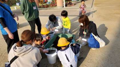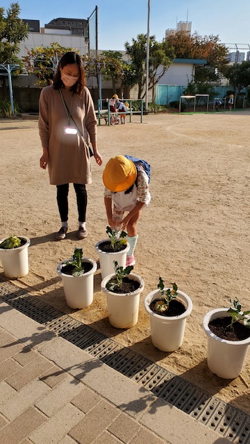 お家の人と一緒に冬野菜の苗を植えました。水菜、ブロッコリー、サニーレタスのなかから好きな野菜を育てます。植木鉢に土を入れて、苗を植え、水をたっぷりあげて…大切に世話をして、成長を楽しみにしていきたいと思います。