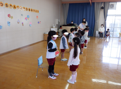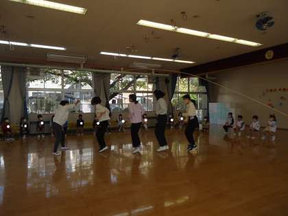 誕生会の後は、子どもたちが長縄跳びで「ゆうびんやさん」をする姿が見られました。