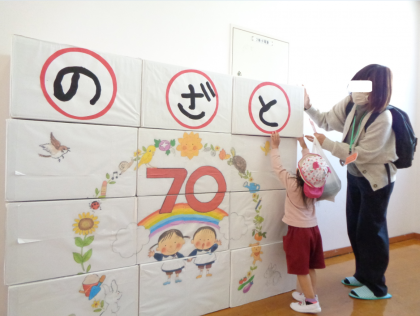 廊下では、5歳児そら組さんが釘を打ってつくったドングリ転がしや、運動会で使ったダンボールパズルで遊べるようにしました。
