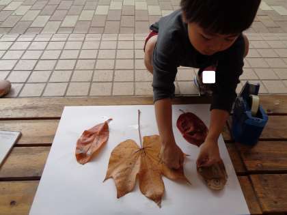 「きれいな色の落ち葉を探してるねん」と落ち葉を見せてくれた子どもがいました。先生が「うわぁ、きれいだね」と答えると、「これに顔をかくねん」と言います。