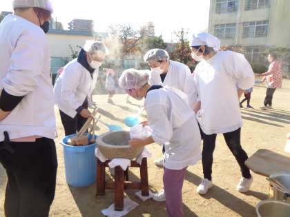 もちつき1 公開日 2022/12/09 更新日 2022/12/09 新規カテゴリ 釜土で薪を燃やしてもち米を蒸す様子を真剣な眼差しで見ていました。 「昔の人は、こんな風にしてお料理を作っていたんだよ」と言う先生のお話に耳を傾けていました。釜土の周りは暖かくて、煙や湯気がよい雰囲気を醸し出していました。 お家の方々も、もちをついたり丸めたり・・・大活躍してくださいました。 もちつきの順番を待つ間、自然と体が動く子どもたちでした。 いいね(0)