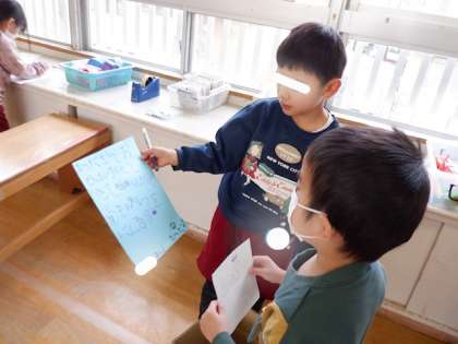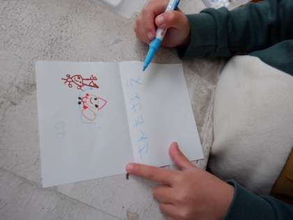 そら組さんは、早速サンタさんにお返事をかいていました。「サンタさんお手紙ありがとう」「サンタさんはどこにすんでいますか?」など、子どもたちの思いがあふれています。相手のことを思いながら、手紙で自分の思いを伝えたい気持ちが、文字をかきたい意欲や、文字への関心を高めるきっかけになっていきます。みんなのお手紙がサンタさんに届きますように!