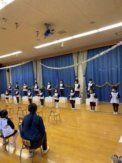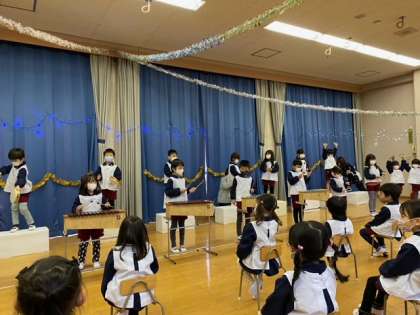 4歳児さくら組さんは、合奏を披露するのは初めてで、とても緊張していましたが、きれいな声で「サンタクロース」の歌を歌ったり、合奏をしたりしていました。