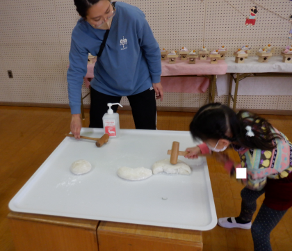 木槌で鏡餅を開きながら「家族みんなが元気でいられますように」などとお願いごとをしていました。