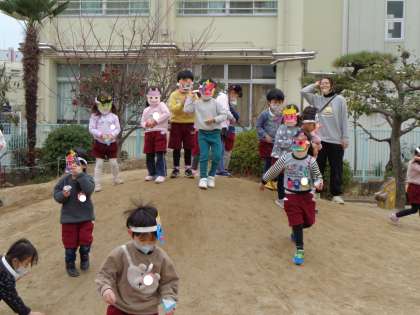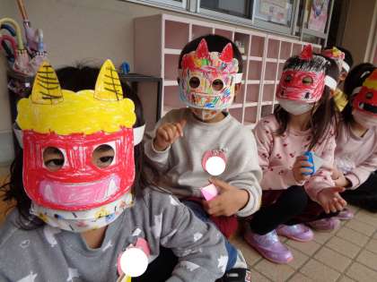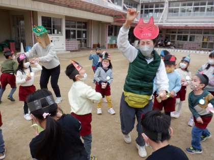 幼稚園の子どもたちが、自分でつくった鬼の面や、角をつけて、豆まきをしました。「鬼は外!福は内!」元気な声が園庭に響きました。
