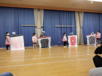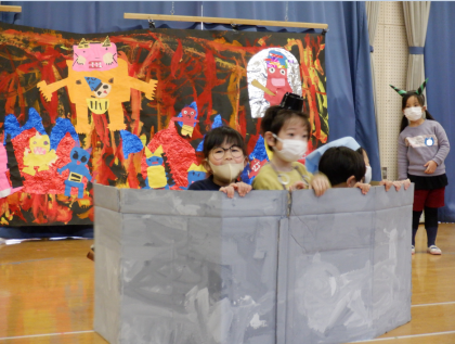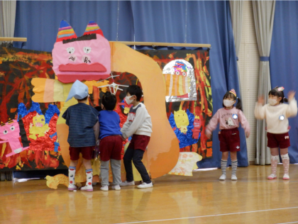 「じごくのそうべえ」の劇遊び、人呑鬼、熱湯の窯、そして、最後にそうべえさんが、地獄から追い出されて、生き返った場面です。「生き返って、よかったな〜」