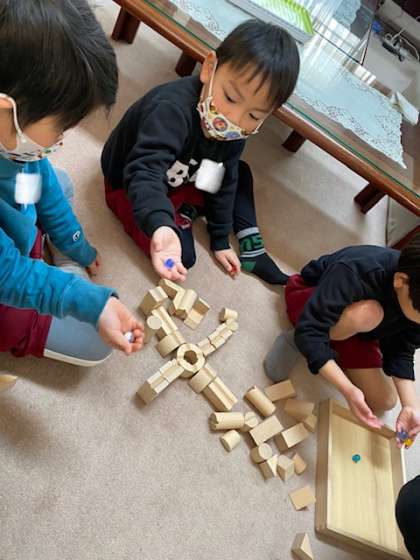 食後は、溝がある積み木を並べてビー玉を転がしたり、テーブルの端っこにあるヘリに沿ってビー玉を転がしたりして、思う存分遊びました。