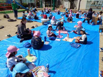 ポカポカ温かい園庭で、4歳児さくら組さんと一緒にお弁当を食べることにしました。