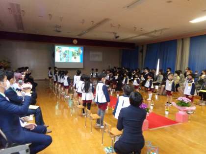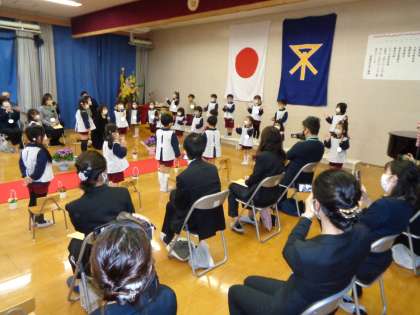 5歳児そら組さんのお別れの言葉と歌は堂々としていて、歌声は胸に迫ってくるようでした。スライドには思い出の写真や、そら組の子どもたち一人一人の赤ちゃんのときと今の顔を映し出しました。とても成長した明るい笑顔の子どもたち。これからも元気で伸び伸び育ってほしいと思います。