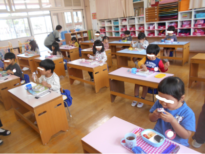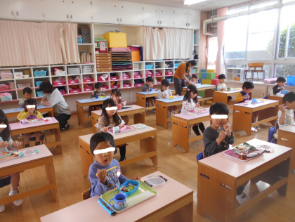 さくら組さんのお弁当が始まりました。先生のお話を聞いて、自分たちで用意も頑張りましたよ。「いただきます」とみんなで挨拶をしてお弁当箱を開けると「わぁ、おいしそう〜」と嬉しそうな子どもたち。「おうちの人がつくってくれたんだよ!」とニコニコ笑顔でお話してくれました。たくさん遊んで、たくさん食べて、大きくなあれ♪