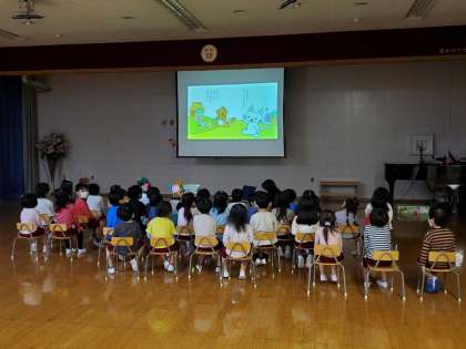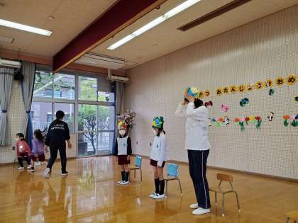 4月生まれのお友達と先生のお誕生のお祝いをしました。そら組さんから、チューリップのかんむりをプレゼントしてもらいました。先生たちからのプレゼント「ノンタンのたんじょうび」のお話を見たり、ふれあい遊び「よろしくね」をおうちの人と一緒にしたりと、楽しい誕生会になりました。これから1年間、みんなのお誕生日をお祝いしましょうね!