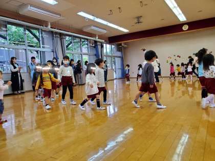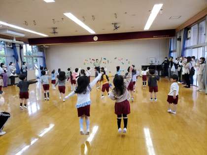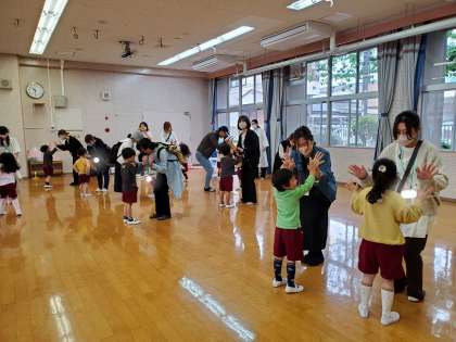 遊戯室では、全園児と保護者の方で集会遊びをしました。そら組さんがさくら組さんを誘って、手を繋いで歩いたり、ダンス「ダンゴムシロック」を一緒にしたりしました。なかよし遊び「よろしくね」は、おうちの人と2人組になって楽しみました。おうちの人に来てもらって、ちょっぴり恥ずかしいけど、とっても嬉しそうな子どもたちでした!