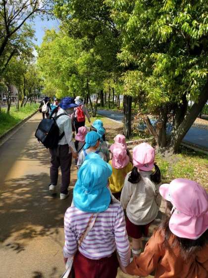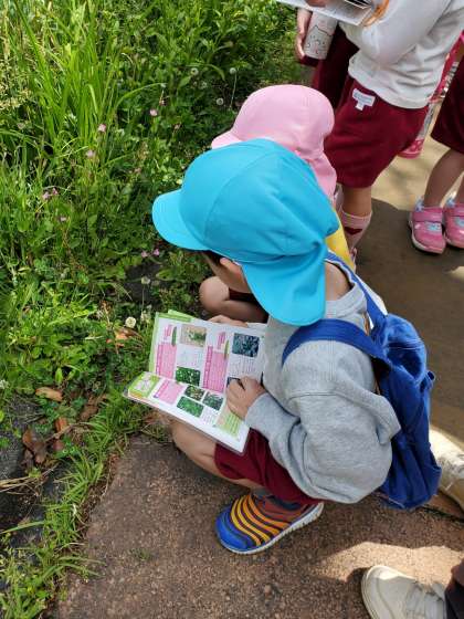 そら組さんとさくら組さんでペアになって歩きます。「風が吹いてきて、気持ちがいいね〜」「見て!車や飛行機も通ってる」と、先生やお友達と話をしながら進みます。道路の脇には色々な草花があり、そら組さんは図鑑で名前を調べ、さくら組さんに教えてあげていました。
