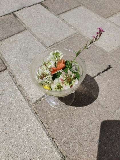 見つけた草花を少し摘んで、幼稚園に持ち帰りました。「おうちの人に見せてあげるの」「これで葉っぱのかんむりつくりたい」「先生にあげるね!」と、それぞれの子どもたちの思いがあふれていました。先生にプレゼントしてくれたお花は大切に飾りましたよ。