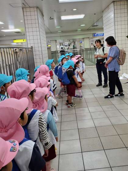 今年度初めての電車に乗っての遠足。駅に集合し、ペアのお友達と手をつないで出発!階段や、電車の乗り降り、車内でのマナーに気を付けて乗車できました。電車から見える景色に「楽しみすぎて心臓がドキドキしてきた…」と可愛いつぶやきも聞かれました。