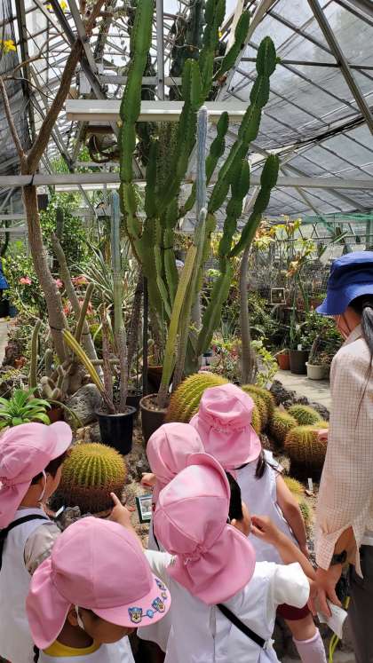 公園に到着すると、園内の様々な植物がお出迎えしてくれました。色鮮やかなバラの花のアーチをくぐると、バラのいい香りが…「ハチミツみたいな匂いがするよ」と教えてくれました。植物園では、自分たちよりも大きなサボテンにびっくり!