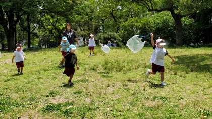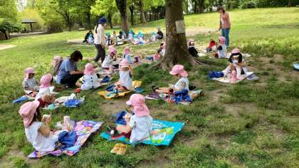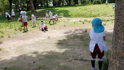 広場でお弁当を食べました。食べた後は、また遊びました。ビニール袋凧や、かざぐるまを持って走ったり、だるまさんがころんだをしたりと、お昼からもたくさん遊びました。