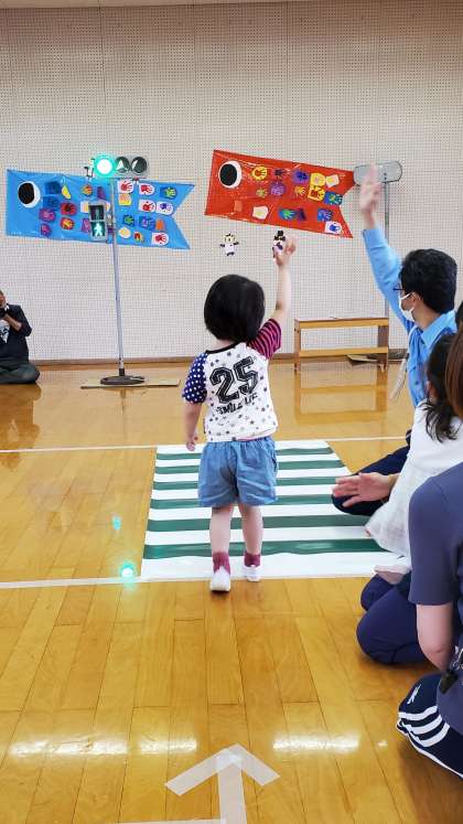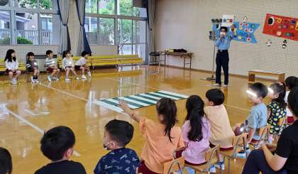 西淀川警察署のおまわりさんが来てくださり、交通ルールのお話を聞きました。正しい信号の見方や道路標識のクイズの後は、一人ずつ歩行訓練をしました。信号が青になってもすぐに渡らず、左右を確認してから手を挙げて渡ろうね。ニコニコ笑顔で渡る子、ちょっぴり緊張している子…みんな一生懸命で可愛かったです!
