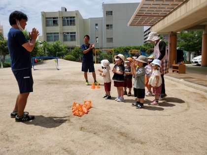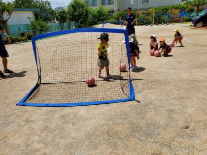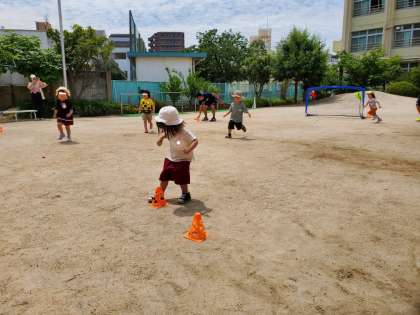ひよこランドのお友達は、コーチとコーンの倒しっこ競争をしました。子どもたちが倒したコーンをコーチが立てて、どちらが多いか競争です。ひよこランドさんの勝ち!で、とっても嬉しそうな子どもたちでした。ゴール近くまでボールをコロコロと転がして…シュートもしましたよ!