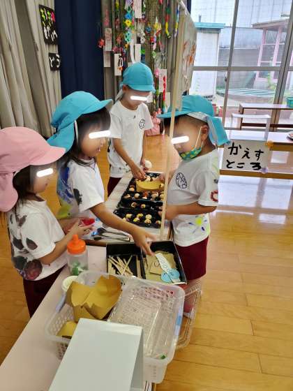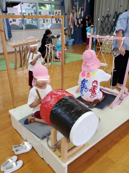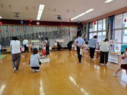 大阪市立幼稚園教育研究会・表現研究部の研究保育があり、他園の先生方が保育を見に来られました。野里幼稚園では、昨年度から「生活の中で心を動かし、表現する喜びを味わう幼児を育む」をテーマに、子どもたちの興味関心に沿った遊び、そのための教師の働きかけや環境構成などの検討を重ね、保育内容の充実を図っています。遊戯室では「のざとまつり」に向けてお祭りごっこが盛り上がっているので、屋台でお店やさん・お客さんになってやりとりを楽しむ姿や、お祭りの音楽に合わせて太鼓やチャンチキを鳴らして遊ぶ姿を見ていただきました。