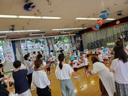 テラスでは水鉄砲としゃぼん玉で遊びました。色々な種類の水鉄砲やしゃぼん玉、効果的な的などの教材研究を行い、子どもたちがイメージや目標をもって遊びを楽しめるよう工夫しました。遊びの最後には子どもたちと教職員、他園の先生方も一緒に「エビカニクス音頭」を踊り、まさに夏祭りムードで大盛り上がりでした!