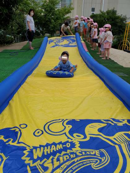 園庭のお山の傾斜を利用して、ウォータースライダーをつくりました。「何あれ!?」「早くやりたーい」と2階からそら組さんも大興奮で見ていました!先日、ウォーターランドの遠足で滑った滑り台を思い出し、喜んでいる子もいました。そら組さん、さくら組さん、ひよこランドのお友達、先生たちも滑りましたよ。みんなの笑顔が輝いていました!