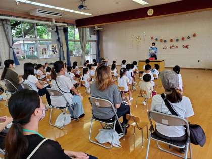1学期最後の日。終業式では、明日からの夏休みに向けてのお話をしました。毎日暑い日が続いているので、先生たちからは『熱中症に気を付けよう!』の劇をしました。交通安全指導では、西淀川警察署のおまわりさんが「車の事故や外出時のトラブルに気を付けようね」と5つお約束をお話してくれました。