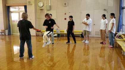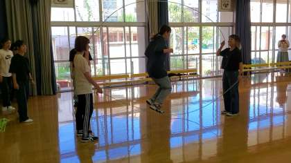 日本ジャンプロープ連合公認インストラクターの皆様を講師にお招きし、ダブルダッチ体験を実施しました。おとなミニ研修では、保護者の方と教員が縄の跳び方や、回し方を教えていただきました。まずはしっかりと準備体操をして…。始めは難しそうだなと戸惑っていた先生や保護者の方も、すぐにコツをつかんで跳べるようになりました!