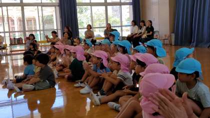 子どもたちも参加し、ダブルダッチのパフォーマンスを見せていただきました。見事な技やダンスに大興奮!「次はみんなが跳んでみよう」の声に「え〜!」と言いながらも「やりたい!」と意欲的な子どもたちでした。初めての体験でしたが、2本の縄を跳ぶことができて、とっても嬉しそう!「もう一回やりたい!」の声もたくさん聞かれました。幼稚園の運動遊びにもつなげていきたいと思います。