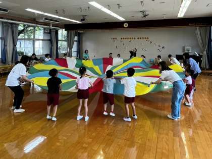 8月生まれのお友達の誕生会をしました。そら組さんが、カブトムシや花火が飾られた夏らしいかんむりをプレゼントしてくれました。先生たちからのプレゼントではパラバルーンの技を披露し、誕生児とおうちの方にも一緒に遊んでもらいました。バルーンの中に入り、夢中でタッチする姿が可愛かったです。その後は、そら組・さくら組の子どもたちもパラバルーン遊びをして、楽しい誕生会になりました。