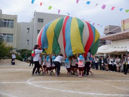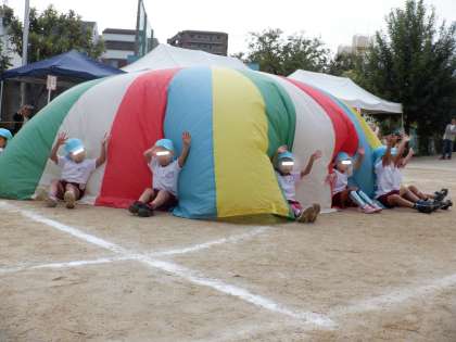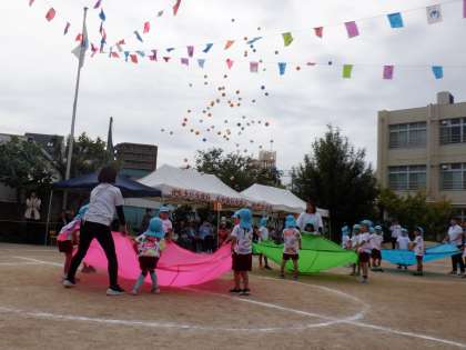 ボール遊びの後にはパラバルーンに挑戦。先生が願いを込めてプログラム名にした通り、そら組全員で“心をひとつ”にして、取り組みました。色とりどりのバルーンやボール・風船が空を舞い、たくさんの歓声や拍手をいただきました!