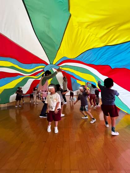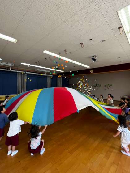 さくら組さんとひよこランドさんは、憧れのそら組さんのまねっこをしてパラバルーン遊び。初めてする動きも理解している子が多く、そら組さんのことをよく見ていたのだなぁと感心させられました。カラーボールを飛ばすのが特に楽しくて大喜びでしたね!