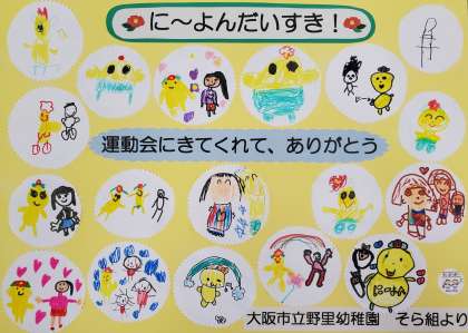 “に〜よん”ありがとう! 公開日 2023/10/26 更新日 2023/10/26 新規カテゴリ そら組さんが、運動会に来てくれた西淀川区マスコットキャラクターの“に〜よん”にお礼のお手紙を書いてくれたので、西淀川区役所にお届けしました。子どもたちのかく絵は本当に可愛いですね! いいね(0)