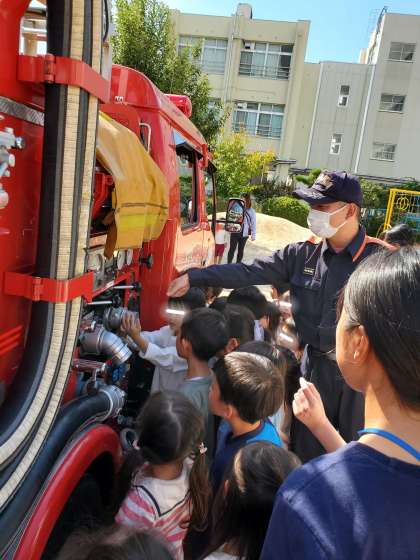 教職員が消火器を使って消火訓練をしたり、消防士さんが素早く隊服に着替える様子を見せていただいたりしました。消防車見学では近くで見る消防車に目を輝かせて、色々と質問していましたよ。