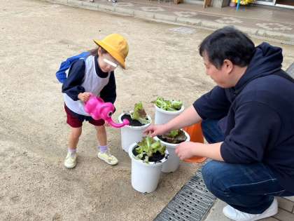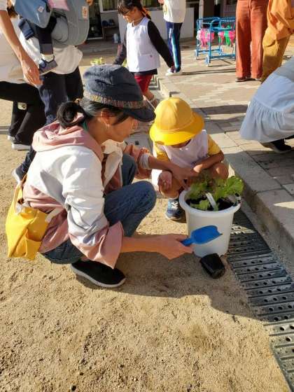 夏野菜に引き続き、おうちの人と一緒に冬野菜を育てます。サニーレタス・ネギ・水菜の中から好きな野菜を選び、苗植えをしました。野菜の世話を通して、自然のおもしろさや生命の大切さを感じる経験、また旬の野菜をいただく食育にもつながってほしいと思います。野菜の生長・収穫を楽しみに大切に育てていきましょうね!