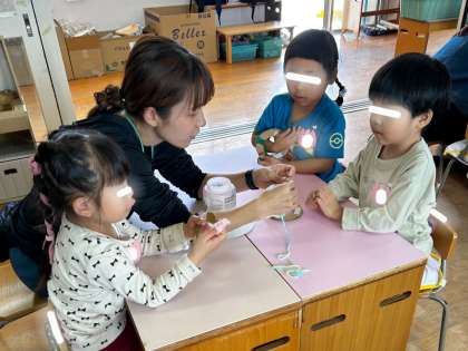 外遊びでは一緒に体を動かして遊んでもらいました。さくら組は、ドーナツ型の台紙に毛糸を巻いたクリスマスリース作りを一緒にしました。そら組は、箱を使ったおうち作りのお手伝いや、クオレ歌島訪問に付き添っていただきました。