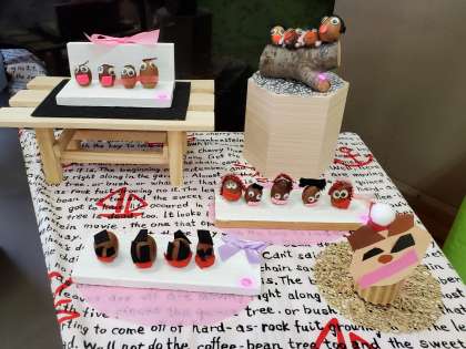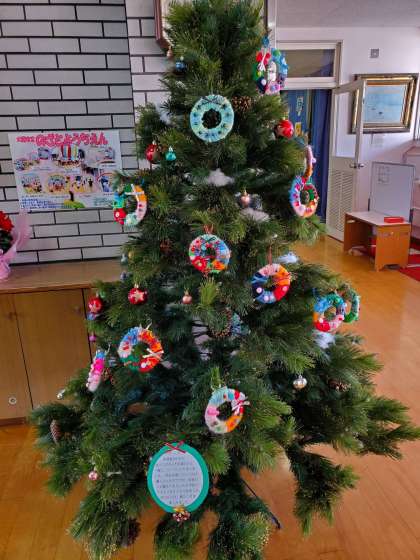 さくら組さんは、他にも園外保育で拾ってきたドングリに顔をつけたドングリ人形や、英字新聞で動物や人をつくったはり絵、保育参加でおうちの人と一緒につくったクリスマスリースなど様々な作品づくりを楽しみました。細かいところも集中して取り組む姿に成長が感じられました。