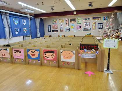 遊戯室には子どもたちのかいた絵画を展示しました。