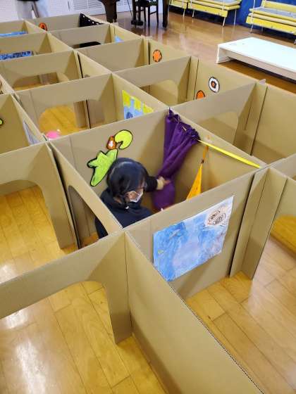 ダンボール迷路で遊ぶコーナーでは、迷路の中に魔法使いの落とし物があり、答えを見つけながらゴールを目指すことを楽しんでいました。