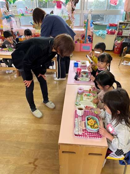 野菜クイズや、給食のメニュー紹介では色々なメニューを見せてもらい、みんなで楽しい時間を過ごしました。お話の後は、お弁当を食べる様子も見てくださいました。「野菜入ってるよ〜!」と先生にお話している姿も…好き嫌いせず、しっかりご飯を食べて、元気に毎日を過ごしましょうね!