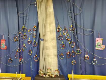 お楽しみ会をしました。会場には子どもたちがつくった可愛いブーツやバッグ、親子製作でつくったリースなどが飾られています。