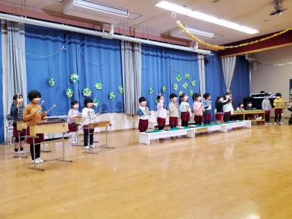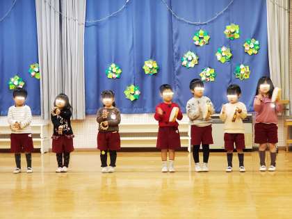 お楽しみ会ではクラスで親しんでいる遊びを披露しました。さくら組さんは「北風のチャチャチャ」の歌と楽器遊び、そら組さんは「星に願いを」の合奏をしましたよ。