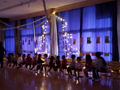 みんながつくった作品や、先日届いたサンタさんからの手紙を見たり、クリスマスツリーや会場のイルミネーションの点灯をしたりしました。