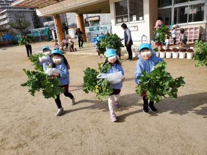 幼稚園の畑でダイコンの収穫をしました。主事さんが今年度初めて植えてくださったのですが、初めてとは思えないほどの立派なダイコンができていました!子どもたちは抜くのも、持ち運ぶのも一苦労です。降園時には、おうちの方も驚いていました。おうちでどんな料理なったのか、また3学期に教えてくださいね!