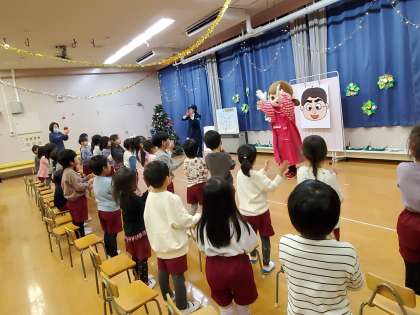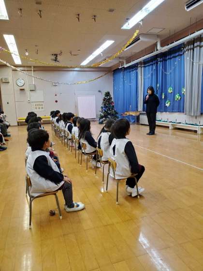 2学期最後の日でした。終業式では園長先生から冬休みに向けてのお話を聞いたり、お楽しみ会で披露した歌や楽器遊びを保護者の方にも聴いていただいたりしました。
