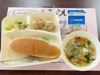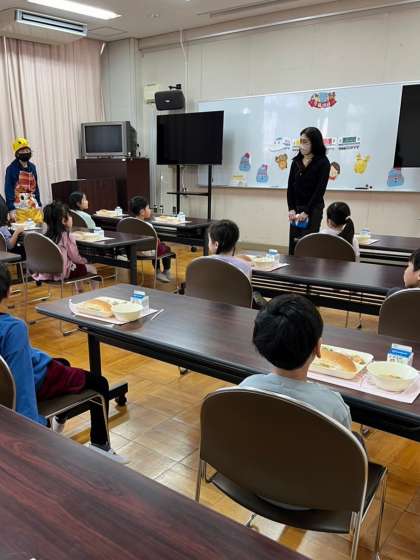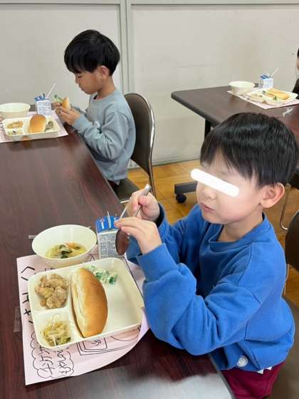 「美味しい!」「最高!」と美味しそうに食べる姿、少し苦手な食材に挑戦してみようとする姿もみられました。栄養教諭の先生が三色食品群のクイズも用意してくださり、食べている一つ一つの食材にどんな栄養があるのかを知ることができました。「また給食食べたいな!」と小学校生活が楽しみになった子どもたちでした。