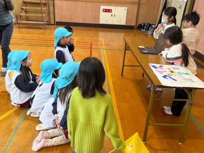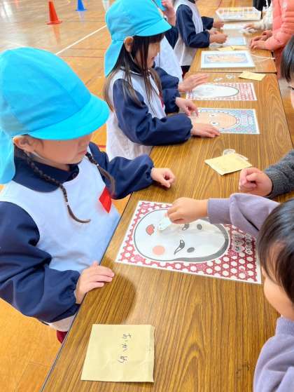 1・2年生のお兄さんお姉さんが、いろいろな昔遊びを教えてくれました。それぞれの遊びのコーナーでお兄さんお姉さんが遊びの紹介をしてくれたり、遊び方を教えてくれたりしました。けん玉、福笑い、手作りの車を使ったレースや、小学校クイズなど、興味津々で遊んでいました。