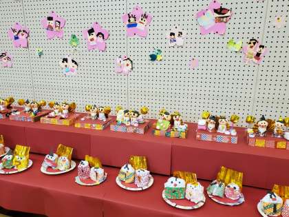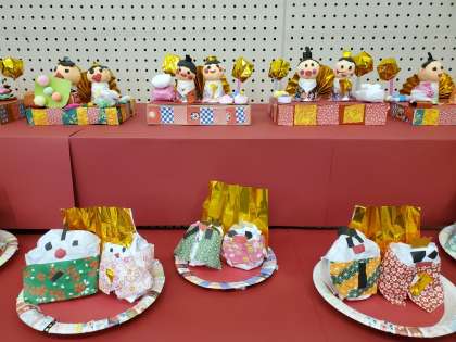 そら組さんは紙粘土で顔を、紙コップに着物を着せて体をつくりました。ぼんぼりやひし餅などの飾りの細かいところも工夫してつくっていますね。